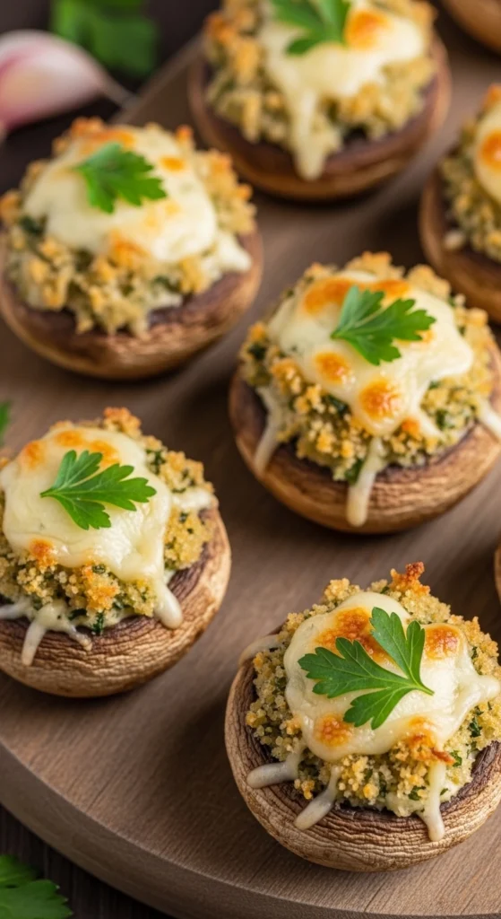 Remove mushroom stems and fill caps with cream cheese, garlic, and herbs. Sprinkle breadcrumbs on top.