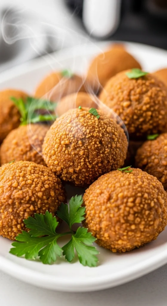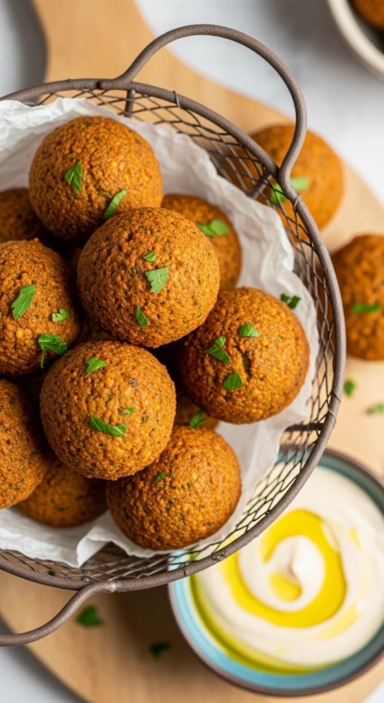 Blend soaked chickpeas with garlic, onion, and spices. Shape into small balls.