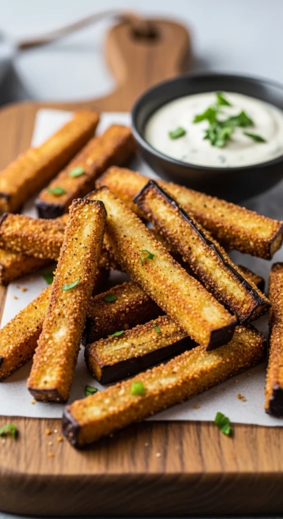 Cut eggplant into thick sticks. Sprinkle salt and let them sit for 15 minutes to remove moisture. Pat dry before coating.